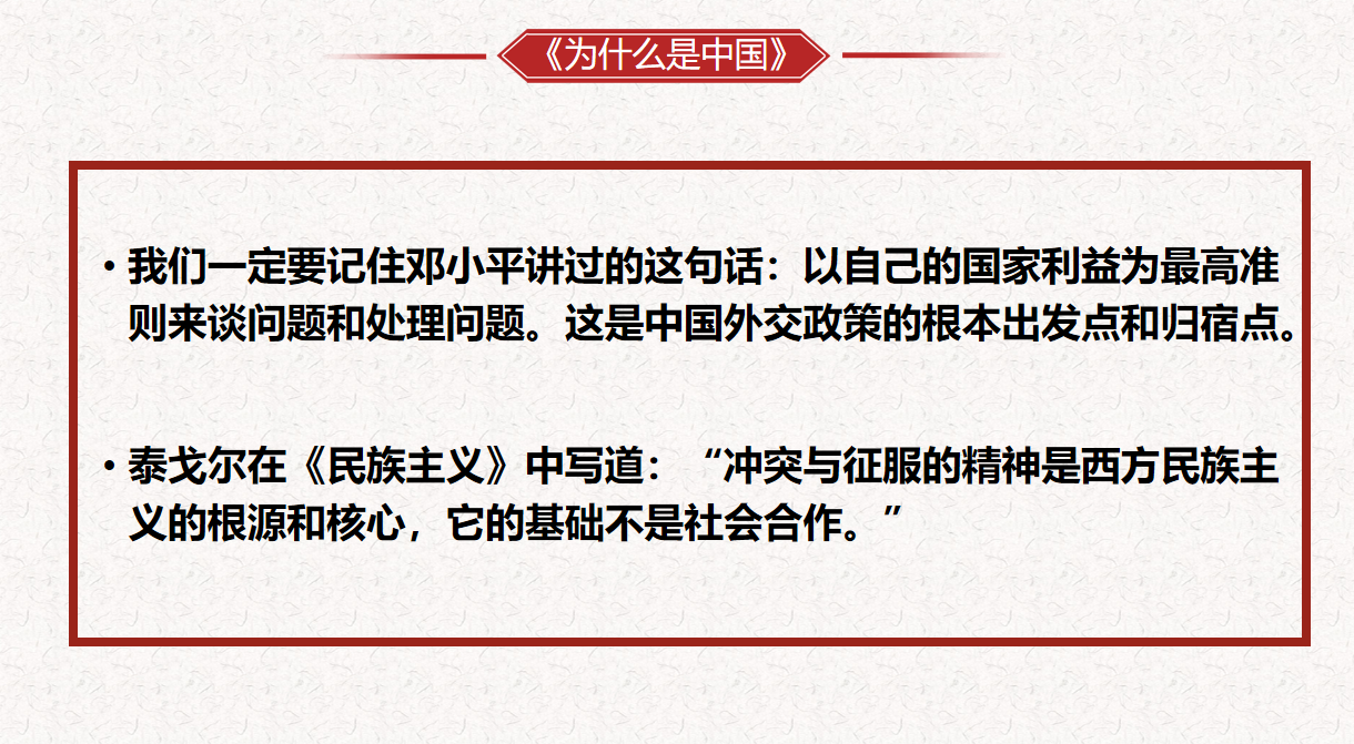 郑州副教授从现实观照历史的角度,对《为什么是中国》最后一章的内容进行解读。指出,当我们看到今天的中国是全球第二大经济体、全球第二大消费国、全球第二大吸引外资国、全球第一制造大国之时,要深刻认识到是什么塑造了中国的百年辉煌,并以全球视角解读了中国道路、中国力量和中国自信。
