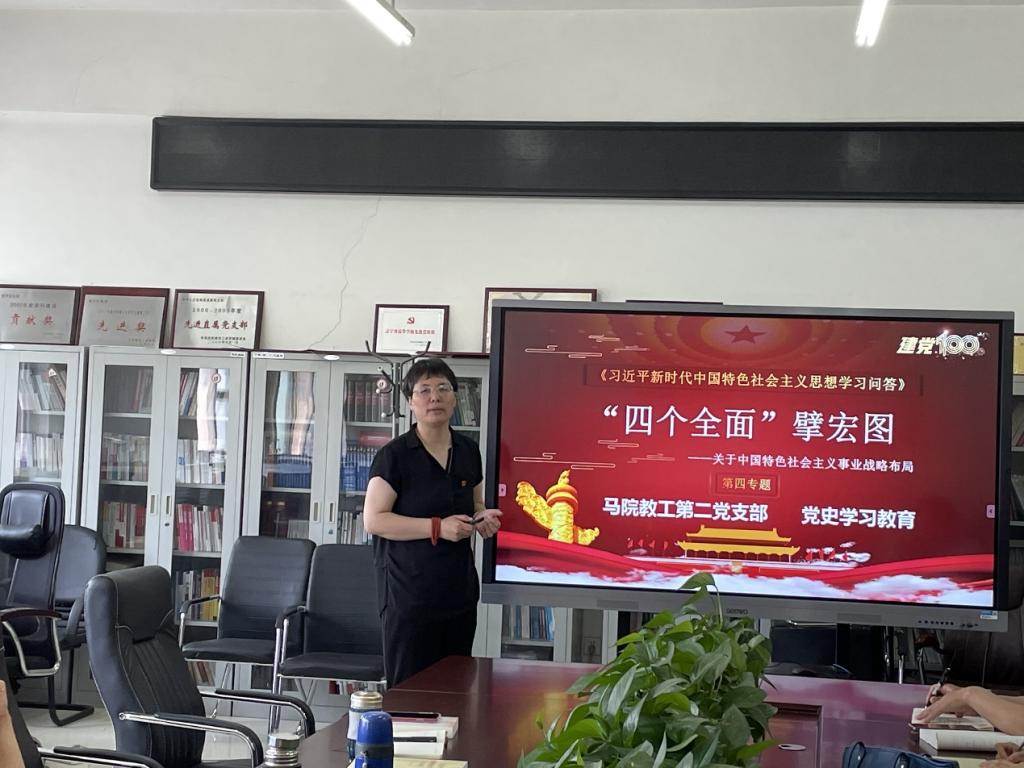 教工第一党支部李金华、教工第二党支部傅畅梅对于《习近平新时代中国特色社会主义思想问答》专题四的内容为各位党员同志详细讲解了协调推进“四个全面”战略布局的有关内容。李金华指出,战略问题是一个政党、一个国家的根本性问题。协调推进“四个全面”战略布局,是党的十八大以来以习近平同志为核心的党中央,立足我国仍处于并将长期处于社会主义初级阶段的基本国情和我国是世界最大发展中国家的国际地位,准确把握经济社会发展不断变化的特点,聚焦新形势下党和国家事业发展中的主要矛盾和突出问题,在坚持和发展中国特色社会主义历史进程中形成的重大理论和实践成果。
