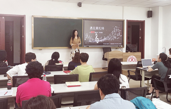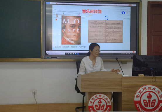 卢海燕老师围绕“音乐何需懂”这样一个引人入胜的话语揭开《遇见莫扎特》的神秘面纱。她主要与各位老师分享了几点心得体会。一是完善的人应该同时拥有三种素质:理性的素质、情感的素质和感性的素质。二是一个人获得幸福的首要条件,是理性的能力。所谓理性能力,就是具有丰富的知识、文化、技能,和分析问题、判断问题,解决问题的果断能力,这样就能拥有幸福生活的物质条件。但是要想体验幸福,还必须有感性能力,要有敏锐的感受、细腻的体验和丰富的需要。三是音乐在人的生活当中的作用,是触发人类心灵深处的感动和全身心的震撼,这是通俗音乐做不到的。只有去欣赏聆听严肃音乐,才能体会到音乐的无穷魅力。音乐是从心灵射向心灵的语言,音乐无须言词,直达人类内心的深处,言说语言无法言说之物,音乐是一种情绪的艺术。