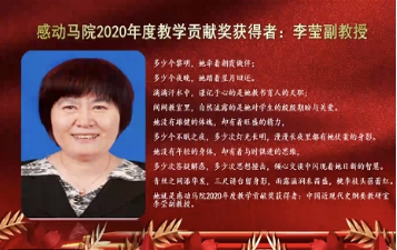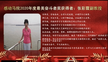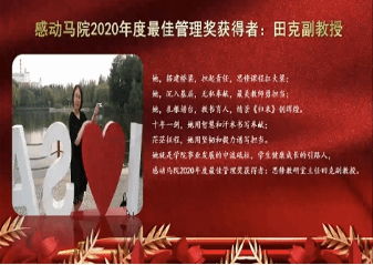 本次大会第一环节为教师表彰奖环节,获奖教师共计7人,分别是感动马院2020年度突出贡献奖赵冰梅、感动马院2020年度最佳管理奖田克、感动马院2020年度科研标兵奖获闫华、感动马院2020年度教学贡献奖李莹、感动马院2020年度最美奋斗奖张彩霞、感动马院2020年度最佳奉献奖王志建,以及感动马院2020年度最佳新人奖王琳琳。yl7703永利党委书记吕健、院长曲洪波依次为获奖教师颁奖,线上领奖后,代表教师发表诚挚感言。