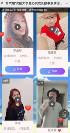 实践教学是《大学生心理与健康》课程的另一项重要任务。为提高教学效果,教师们一直致力于实践教学的探索和改革。在疫情形势下,依托于一年一度的“沈航大学生心灵成长故事演讲比赛”,将理论教学和实践教学紧密结合,开启第六届“沈航大学生心灵成长故事演讲比赛”决赛网络云评选活动,让广大学生都能参与到这项活动中来,能够切实体会、感受他人挫败的沮丧与不甘、心灵的思索与洗涤、成功的经验与喜悦……