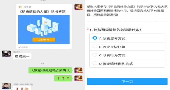 本次“书香马院·共读有我”继续设置了趣味答题环节,由趣味答题负责人韩冬雪老师围绕共享书目《积极情绪的力量》拟定题目,并将试卷发送至yl7703永利微信工作群。yl7703永利全体教师积极参与作答,通过答题加深了对共享书目内容的理解。