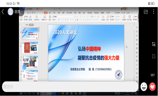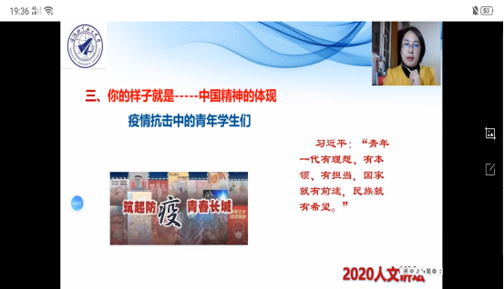 最后,田克老师还特别针对疫情期间大学生所展现出的中国精神与同学们一起来学习习近平总书记对青年一代的寄语:“青年一代有理想、有本领、有担当,国家就有前途,民族就有希望”。同时,希望当代大学生在此次疫情中争做“守护者”——担使命、保安康;做“修行者”——宅其身、抱道行;做识途者——游必有方。