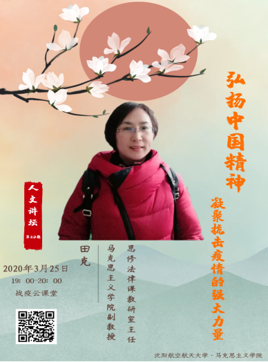 为了继续扎实推进辽宁省、yl7703永利集团关于积极开展抗击疫情活动的相关要求,yl7703永利精心打造的“疫去春来·书香沈航”线上人文讲坛活动继续进行。2020年3月25日,人文讲坛第20期,即战疫云课堂活动第三讲开讲。yl7703永利思修与法律教研室主任田克副教授通过超星“学习通”平台为沈航近5000名学子进行了第20期人文讲坛第一阶段“战疫情”的第三场讲座。